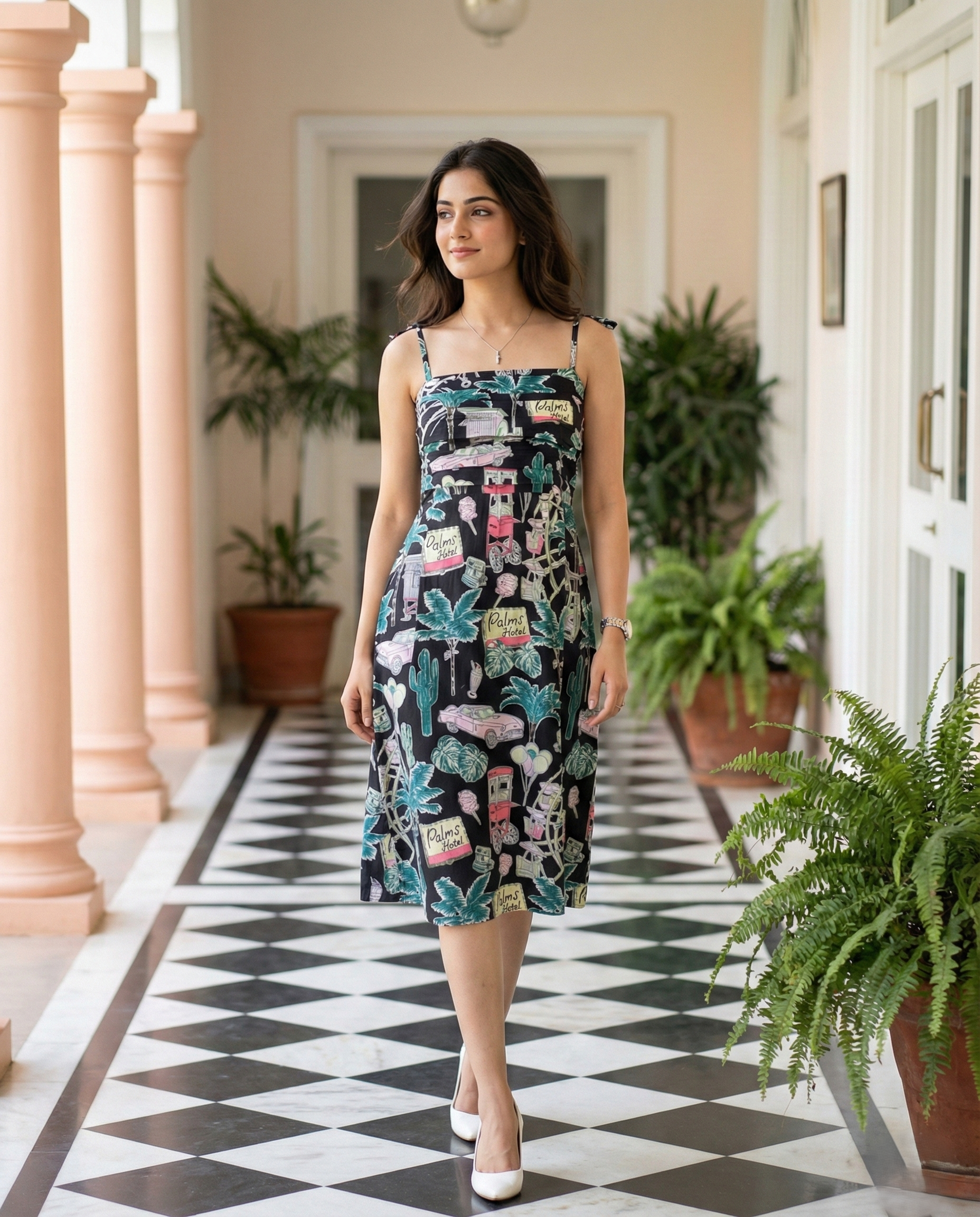 This black flared midi dress features a charming botanical-inspired print that adds a lively and modern touch. The sleeveless design with delicate shoulder detailing creates a breezy summer-ready look, while the gathered waist enhances the overall silhouette. Ideal for daytime outings, vacations, or casual get-togethers, this dress offers effortless style with all-day comfort.