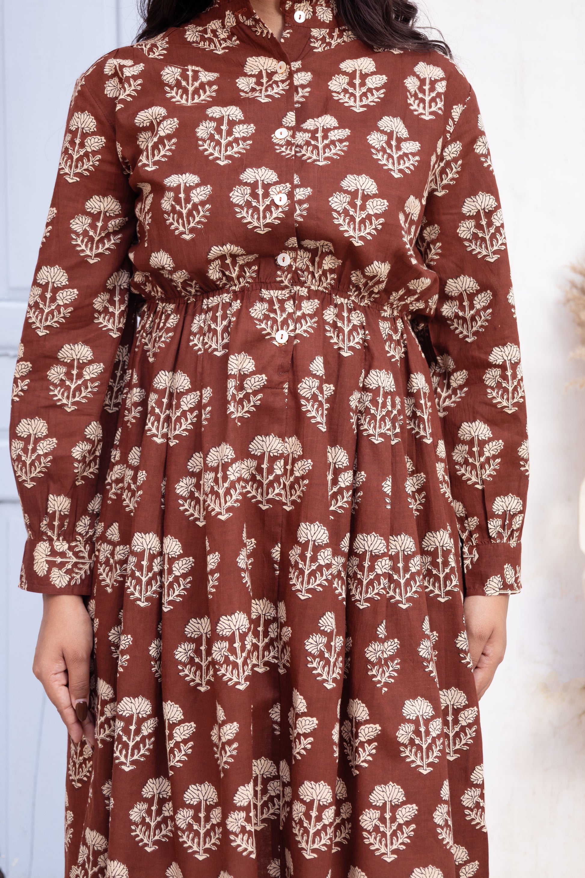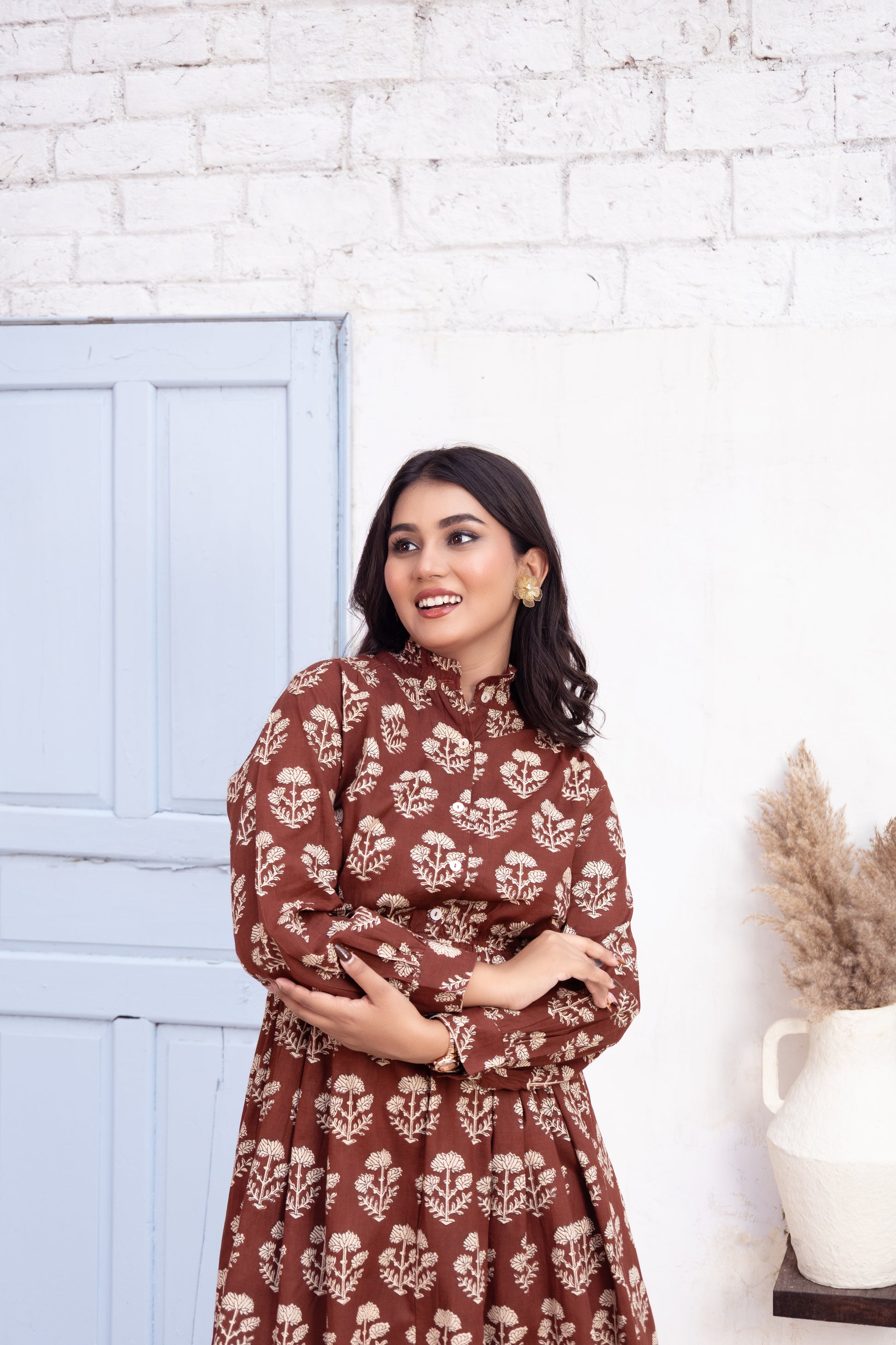 This charming midi dress features a rich brown hue with delicate floral prints, offering a warm, earthy vibe. The high-neck design and long sleeves bring a refined, modest touch to the relaxed fit of this dress. The cinched waist adds structure and definition, while the flowy skirt provides comfort and ease. Perfect for casual outings or an elegant brunch, this dress blends bohemian style with a touch of sophistication.