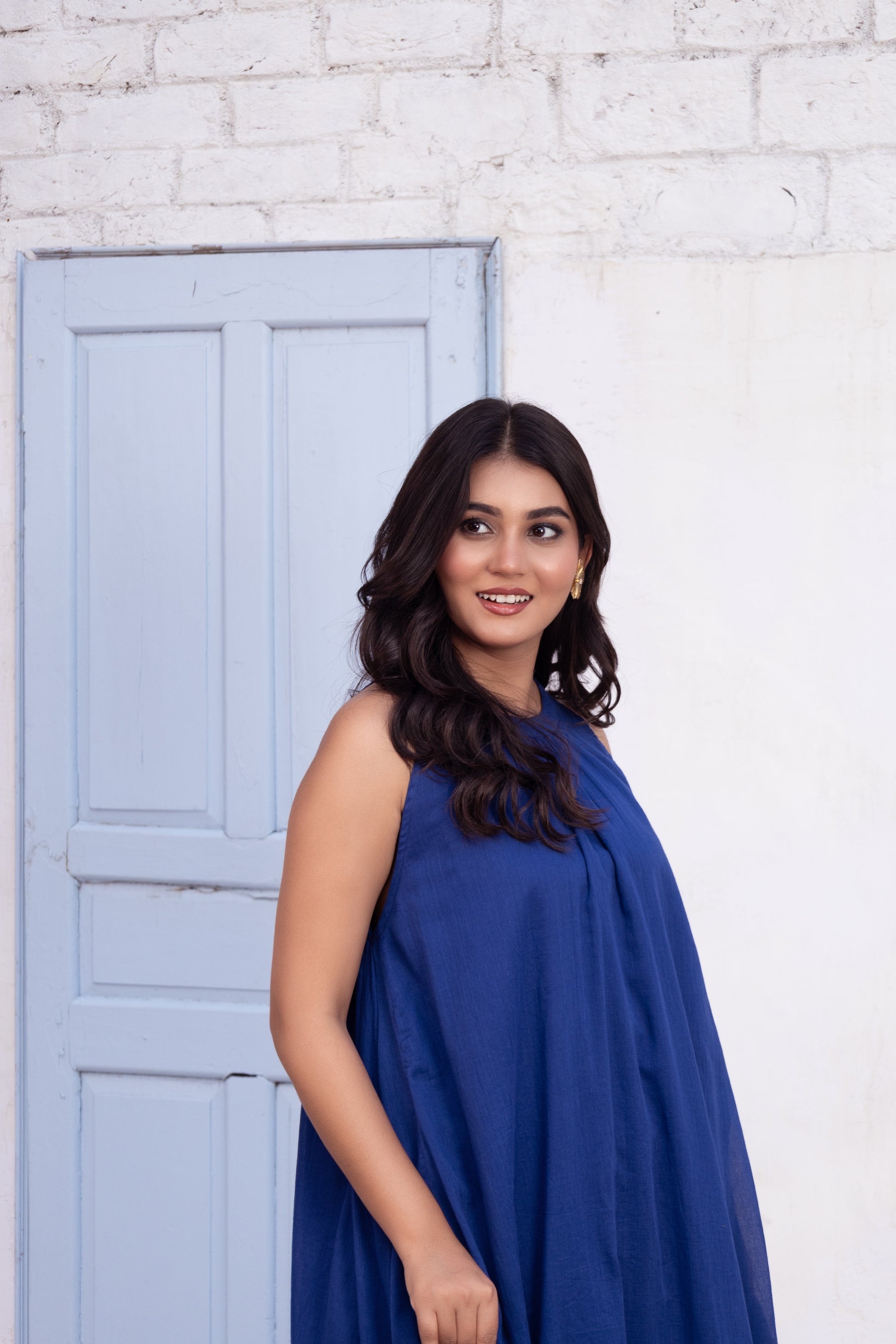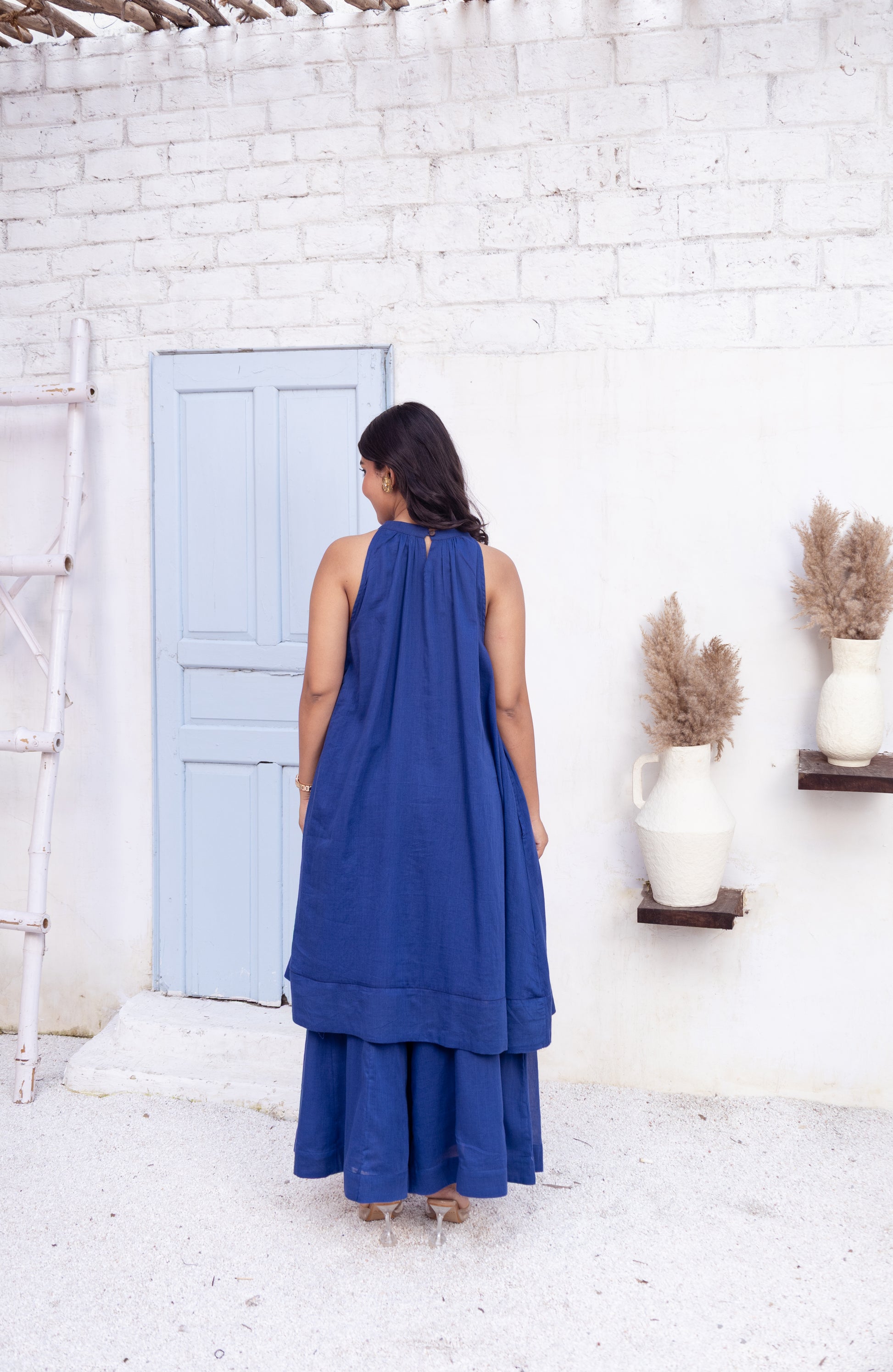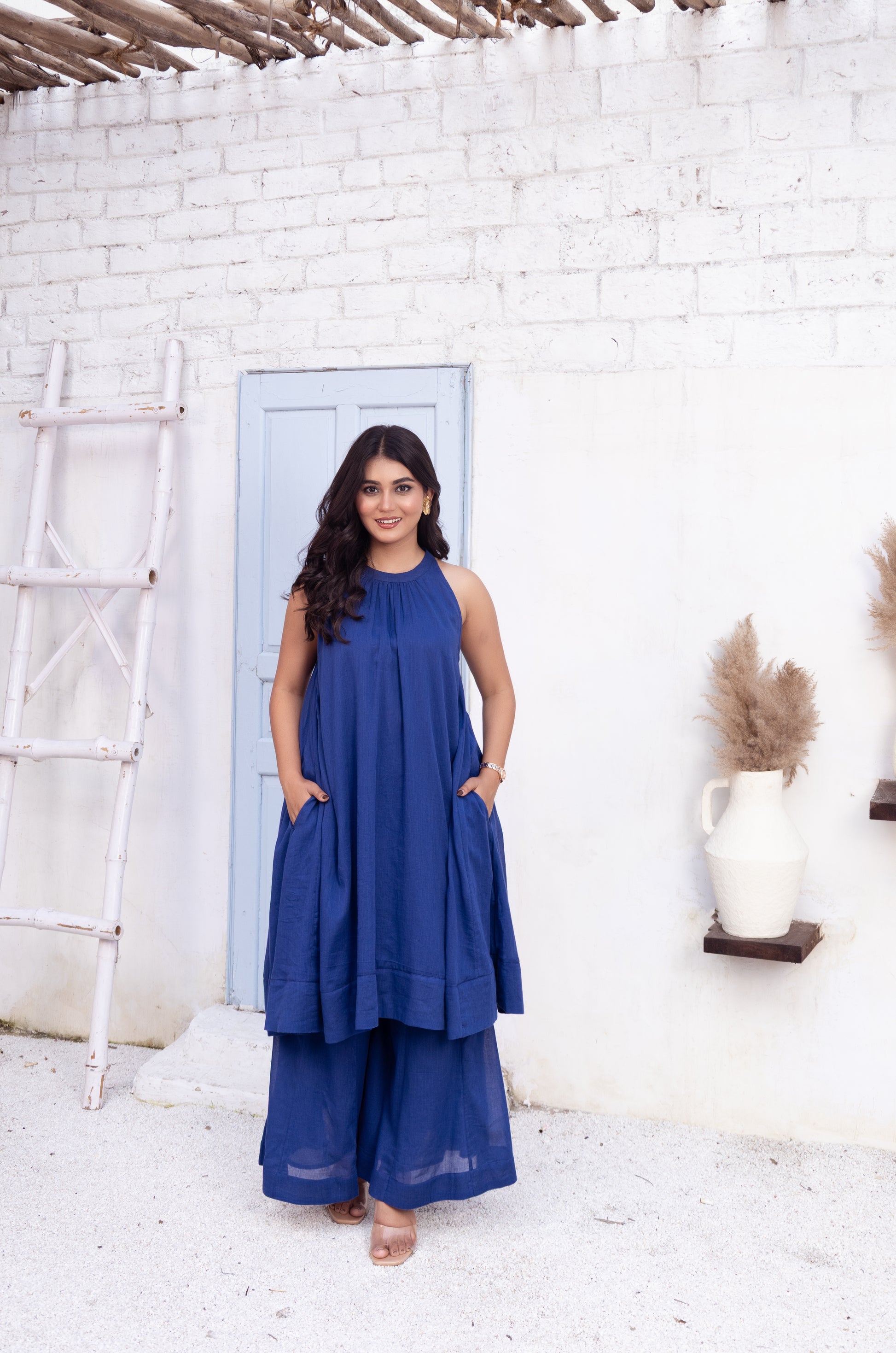 This effortlessly chic blue maxi set features a halter neck tunic paired with wide-leg pants, offering a perfect blend of comfort and style. The flowy silhouette provides ease of movement, making it ideal for a day out or casual gatherings. The simple yet elegant design highlights a refined aesthetic, perfect for those who appreciate laid-back luxury.