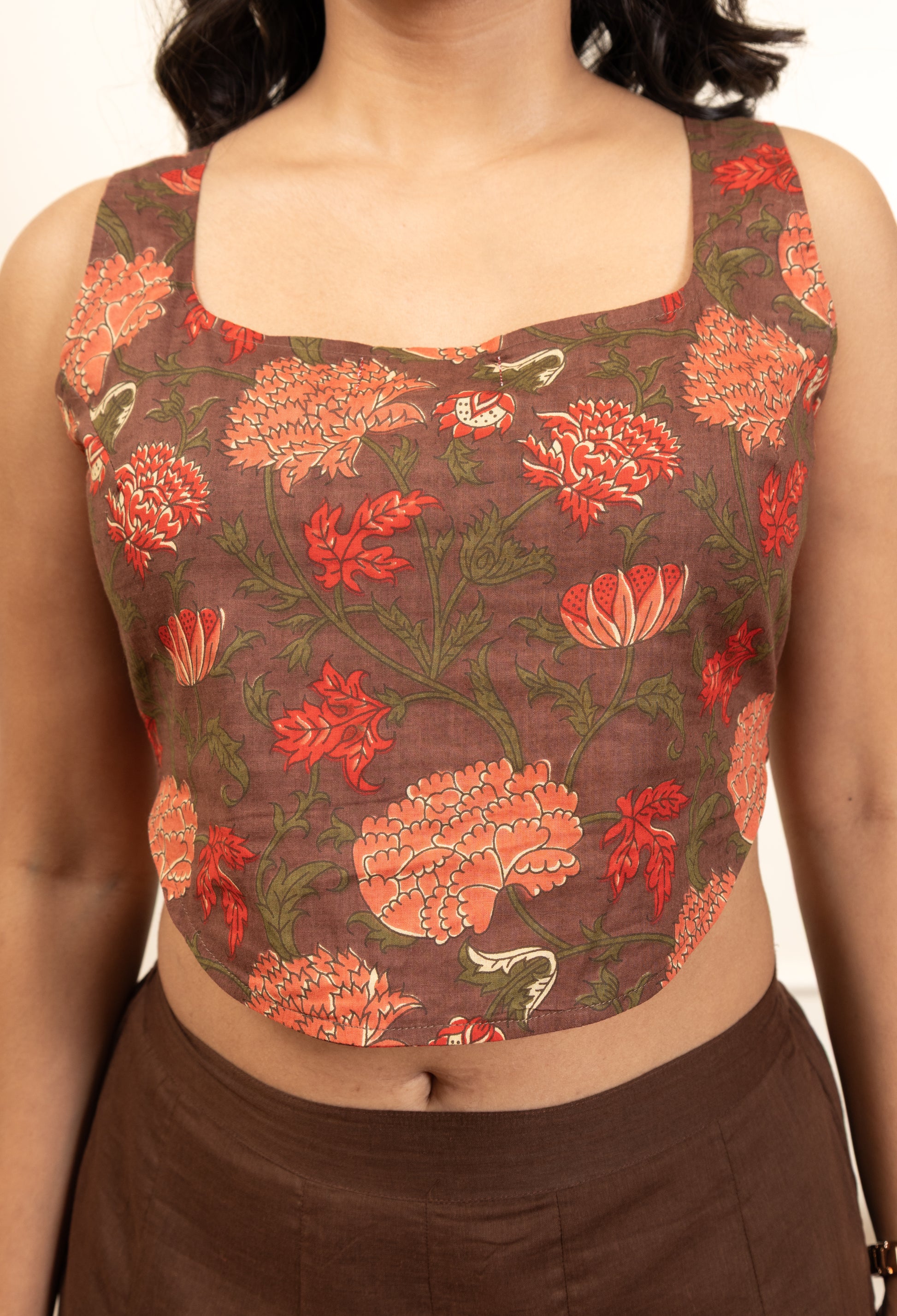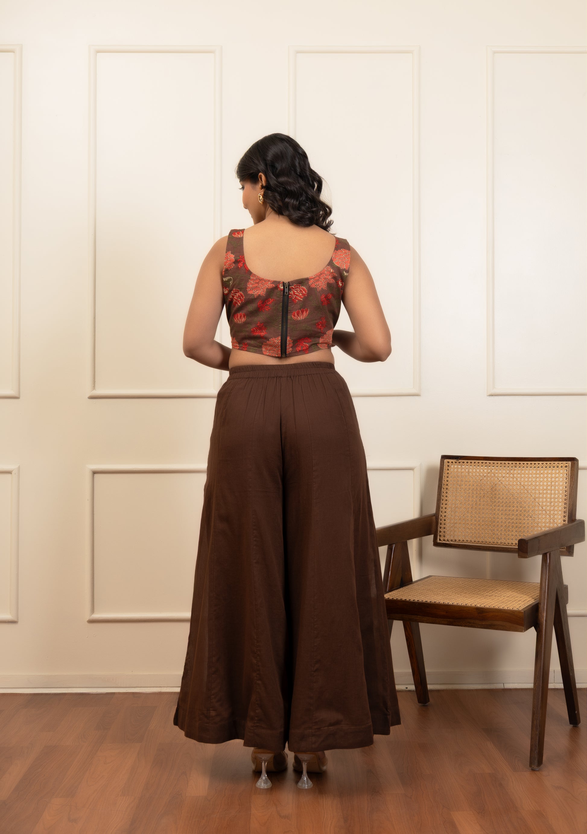 Step into effortless elegance with this chic coord set featuring a sleeveless printed crop top paired with wide-leg brown pants. The stylish crop top adds a vibrant touch with its eye-catching print, while the flared pants ensure a relaxed yet fashionable look. Perfect for casual outings, brunches, or evening get-togethers, this outfit blends comfort with modern style.