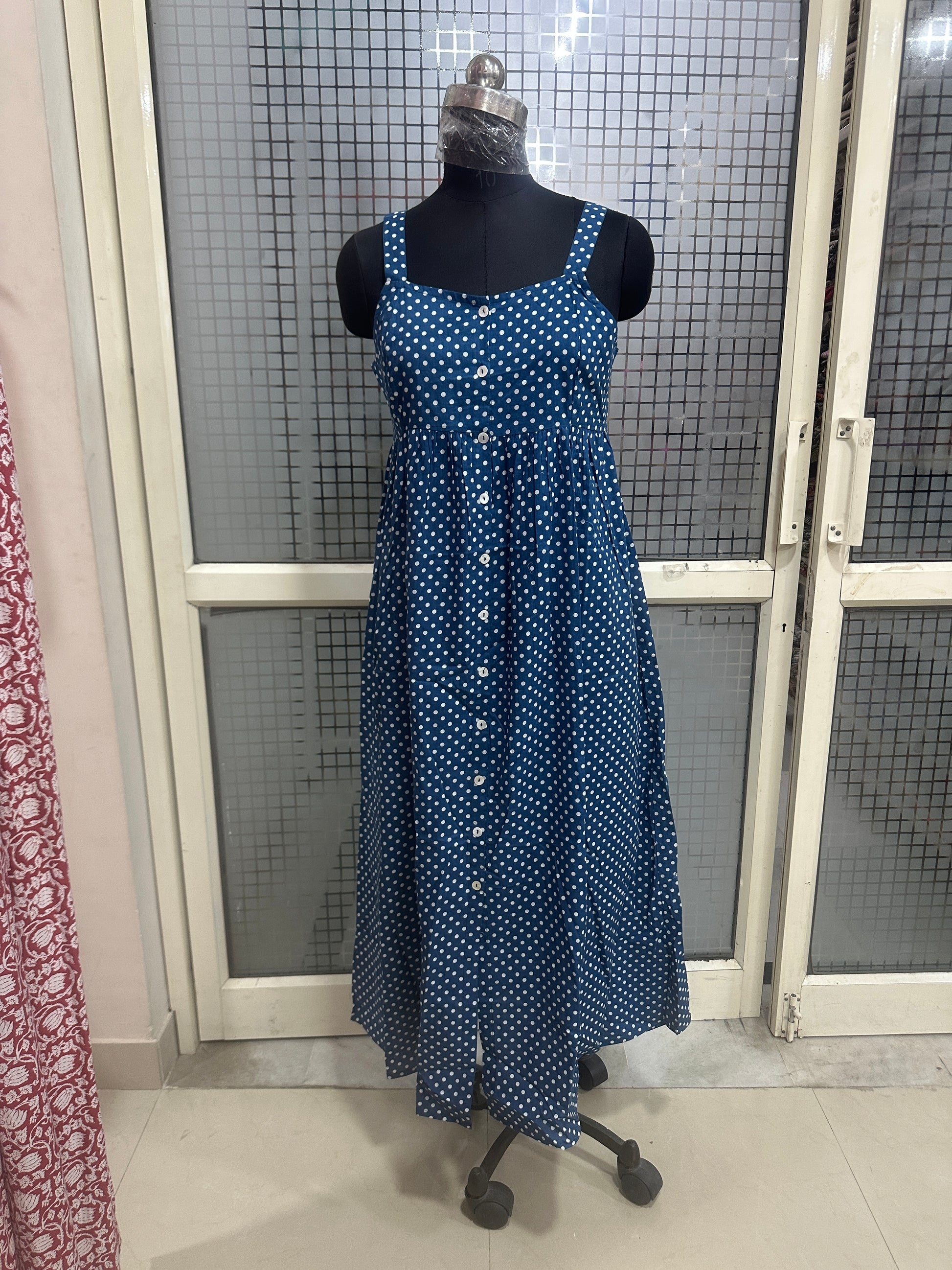 The Polka Breeze Button-Down Dress brings together classic charm and effortless comfort. Designed in a soothing blue shade with playful white polka dots, this sleeveless maxi features a flattering gathered waist and a full button-down front for a chic, flowy silhouette. Perfect for casual outings, brunch dates, or a relaxed summer day.
