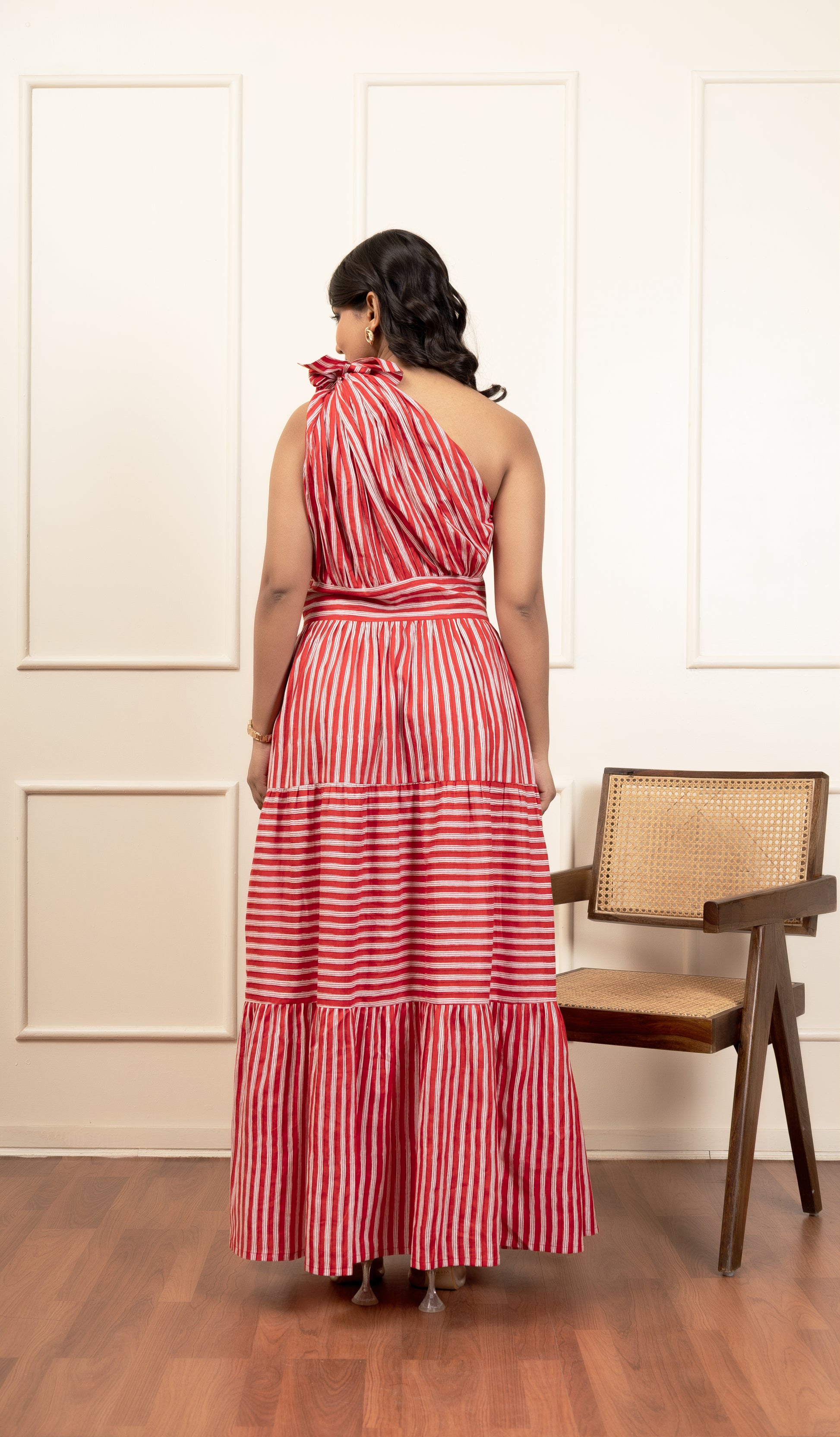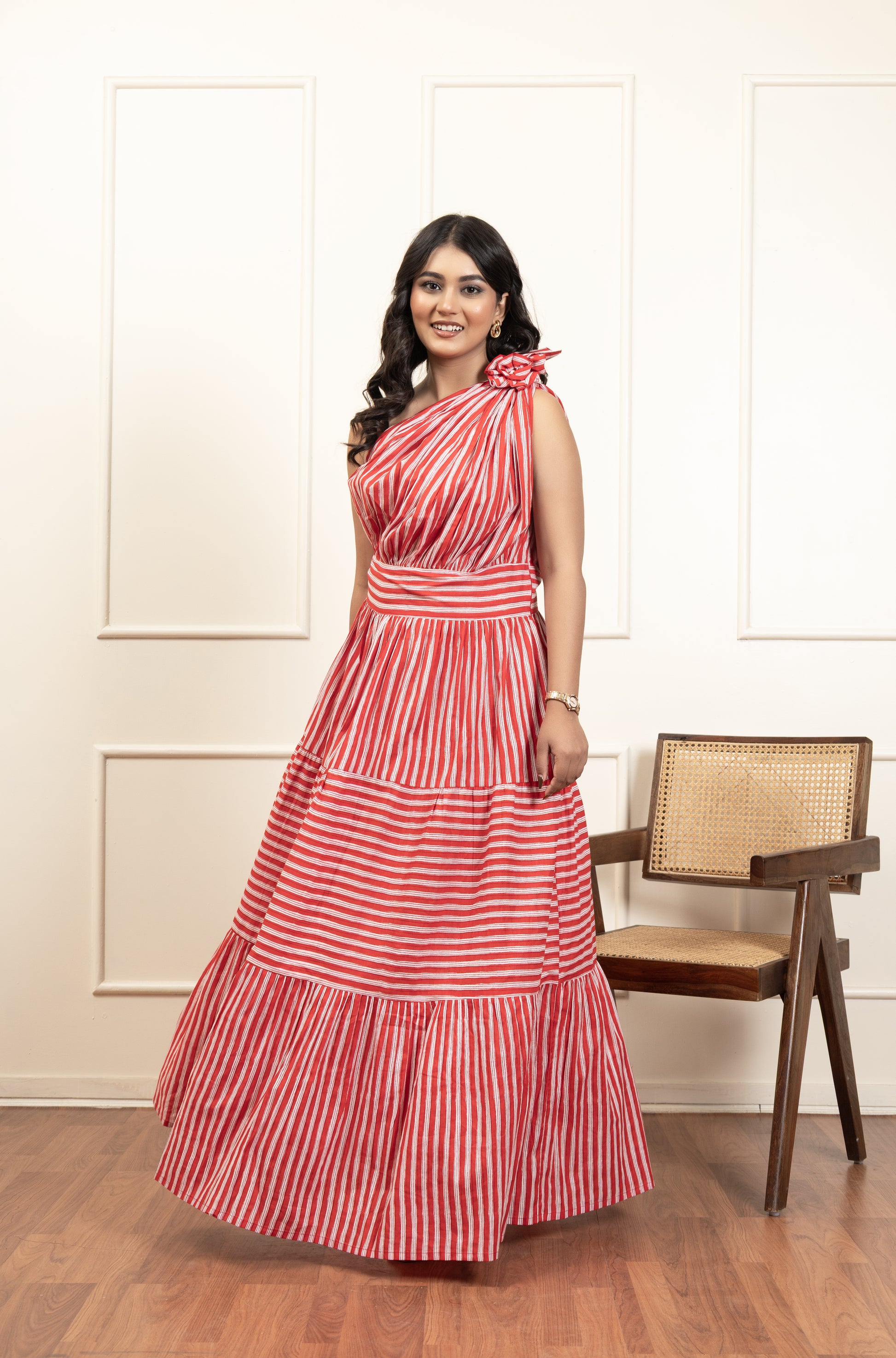 Turn heads in this striking one-shoulder dress featuring bold red and white stripes. The flowy silhouette with a tie-up shoulder detail adds a playful yet elegant charm, making it perfect for daytime outings, brunch dates, or evening soirees. A blend of chic style and effortless comfort, this dress is designed to make you stand out with ease.