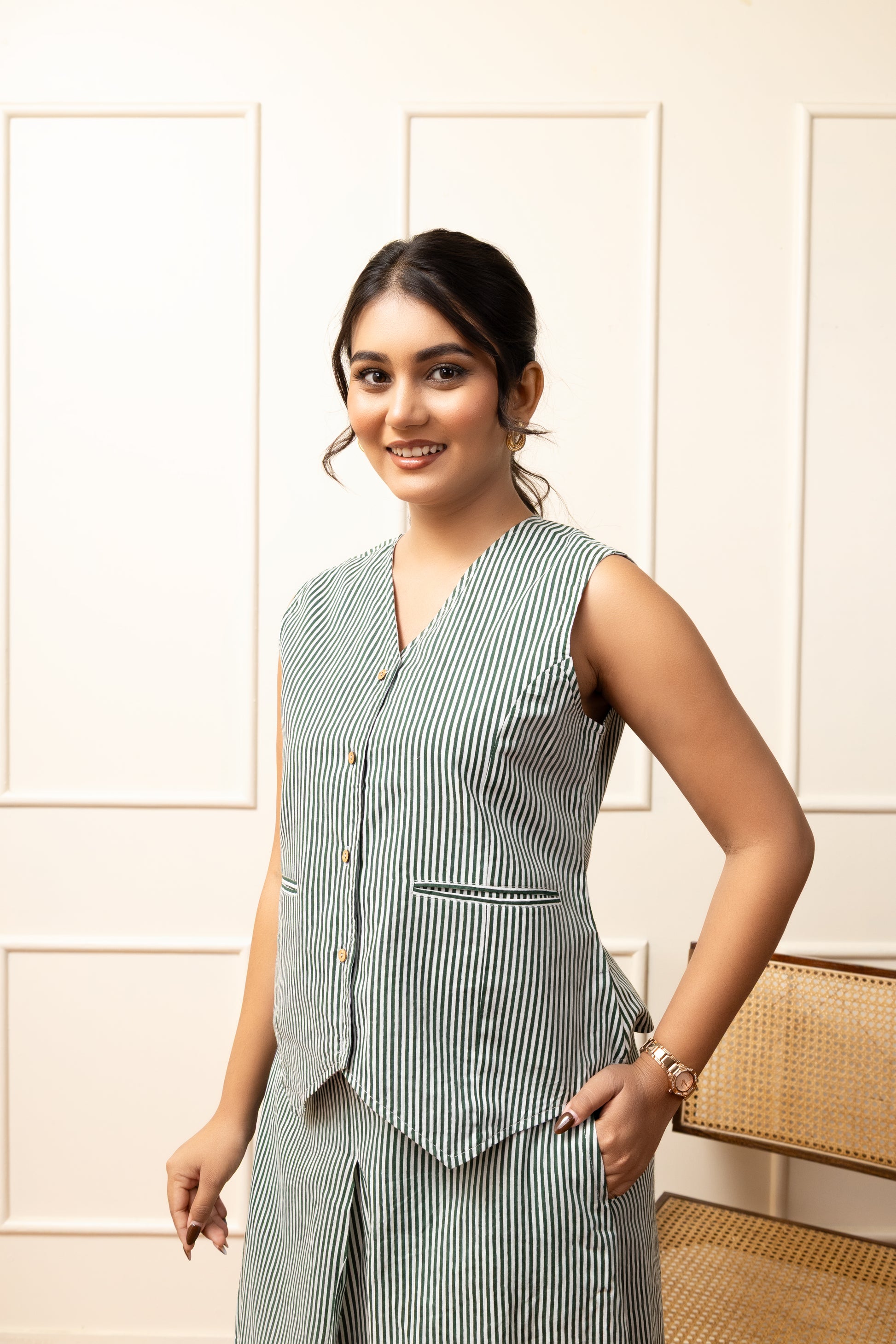 Elevate your everyday style with this effortlessly chic striped co-ord set. Featuring a sleeveless V-neck top with front buttons and a relaxed fit, paired with wide-leg culottes that offer both comfort and sophistication. Perfect for casual outings, brunch dates, or relaxed office days, this set brings a touch of modern elegance to your wardrobe. Style it with minimal accessories and heels for a complete look.