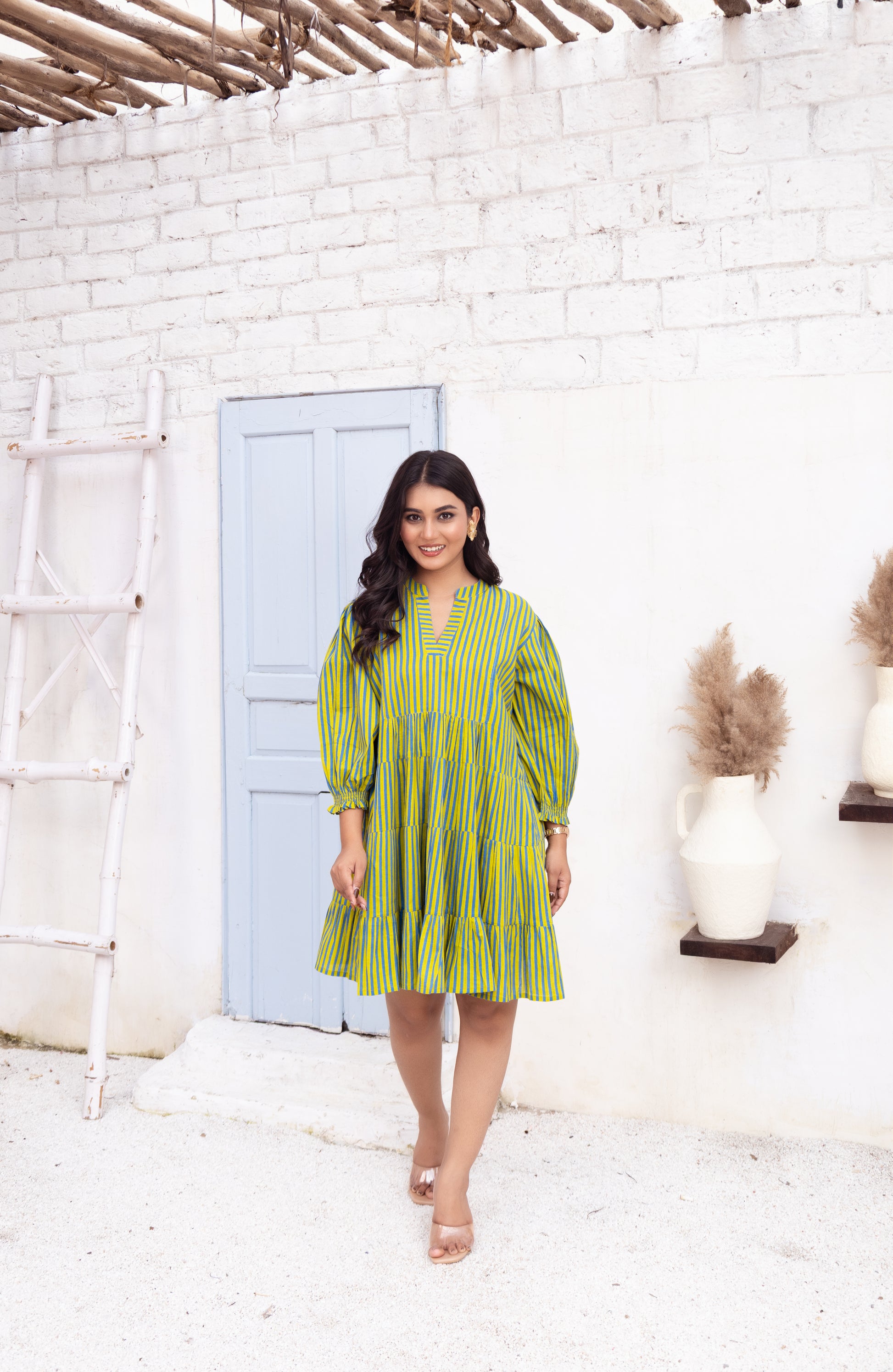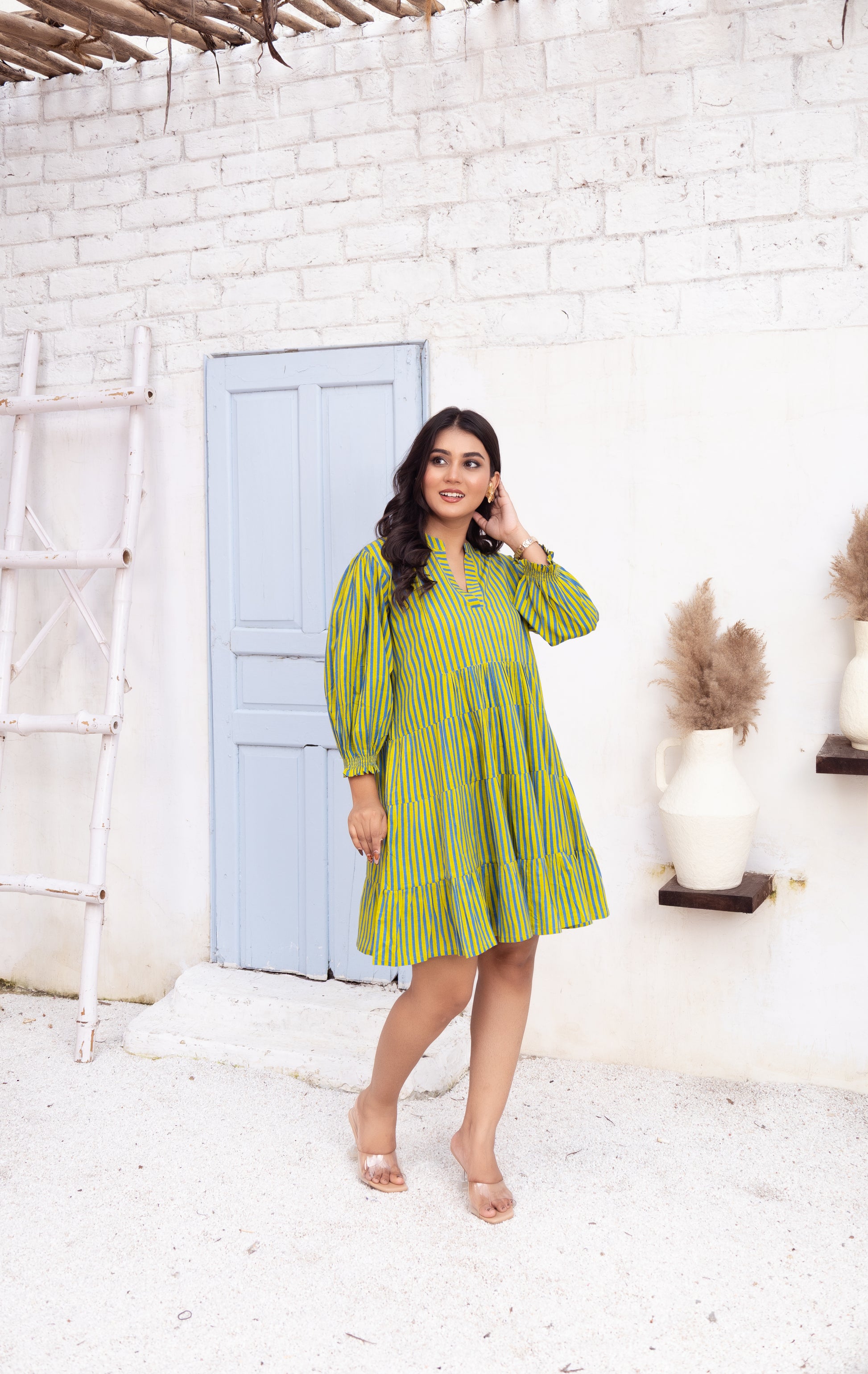 This vibrant striped shirt dress combines bold green and yellow hues in a playful, tiered design. With a relaxed fit and flowy silhouette, it offers both comfort and style for your casual outings. The statement sleeves and collared neckline enhance the dress's contemporary charm, making it perfect for day-to-night wear. Whether you're running errands or enjoying a day out, this dress brings a touch of fun to your wardrobe.