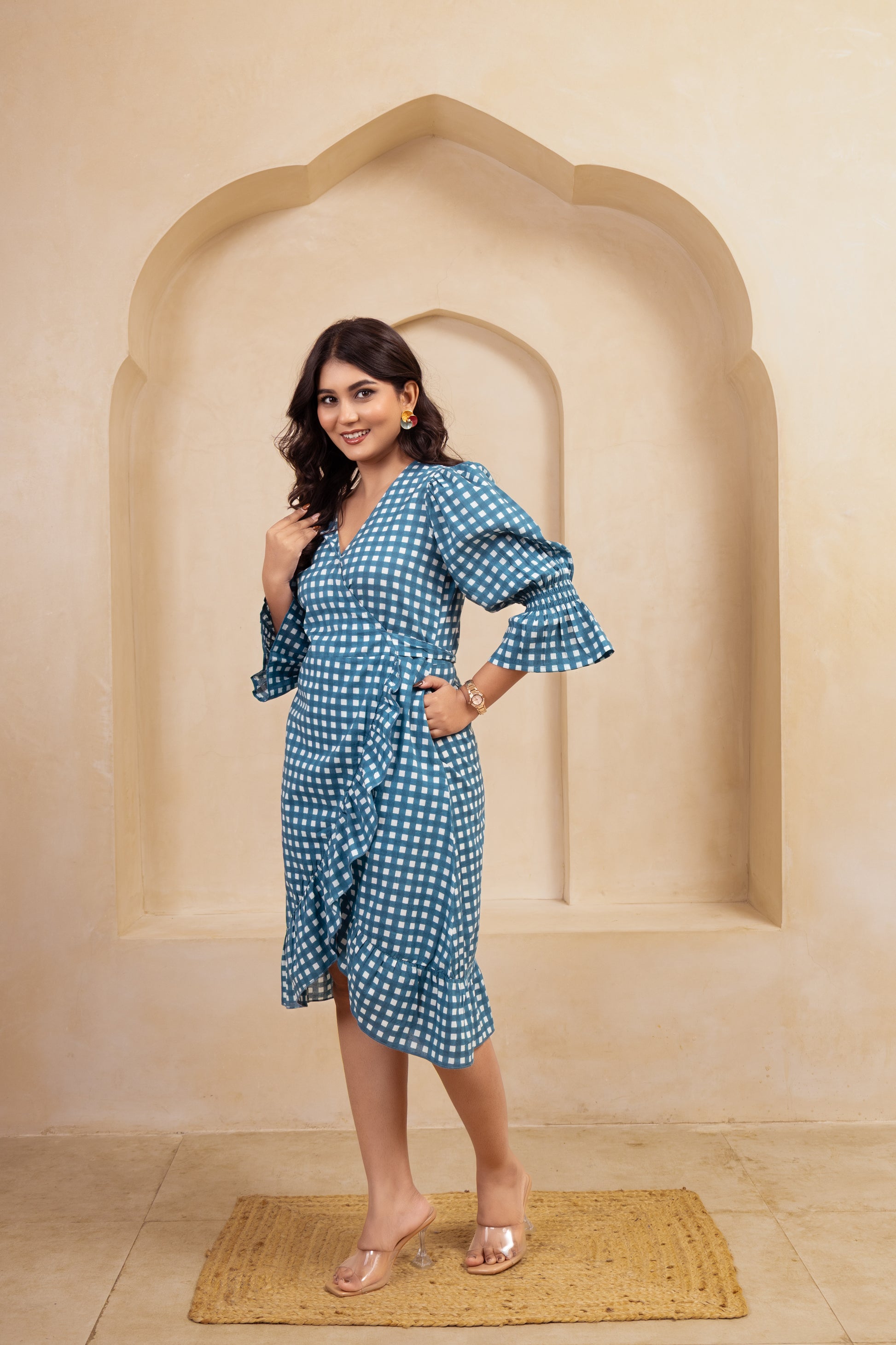 Flaunt your feminine charm in this teal wrap dress adorned with white checks. Designed with statement puff sleeves, a flattering V-neckline, and ruffle accents along the hem, it brings a modern twist to classic elegance. The adjustable waist tie ensures a perfect fit, making it your go-to choice for dinners, parties, or a stylish day out.
