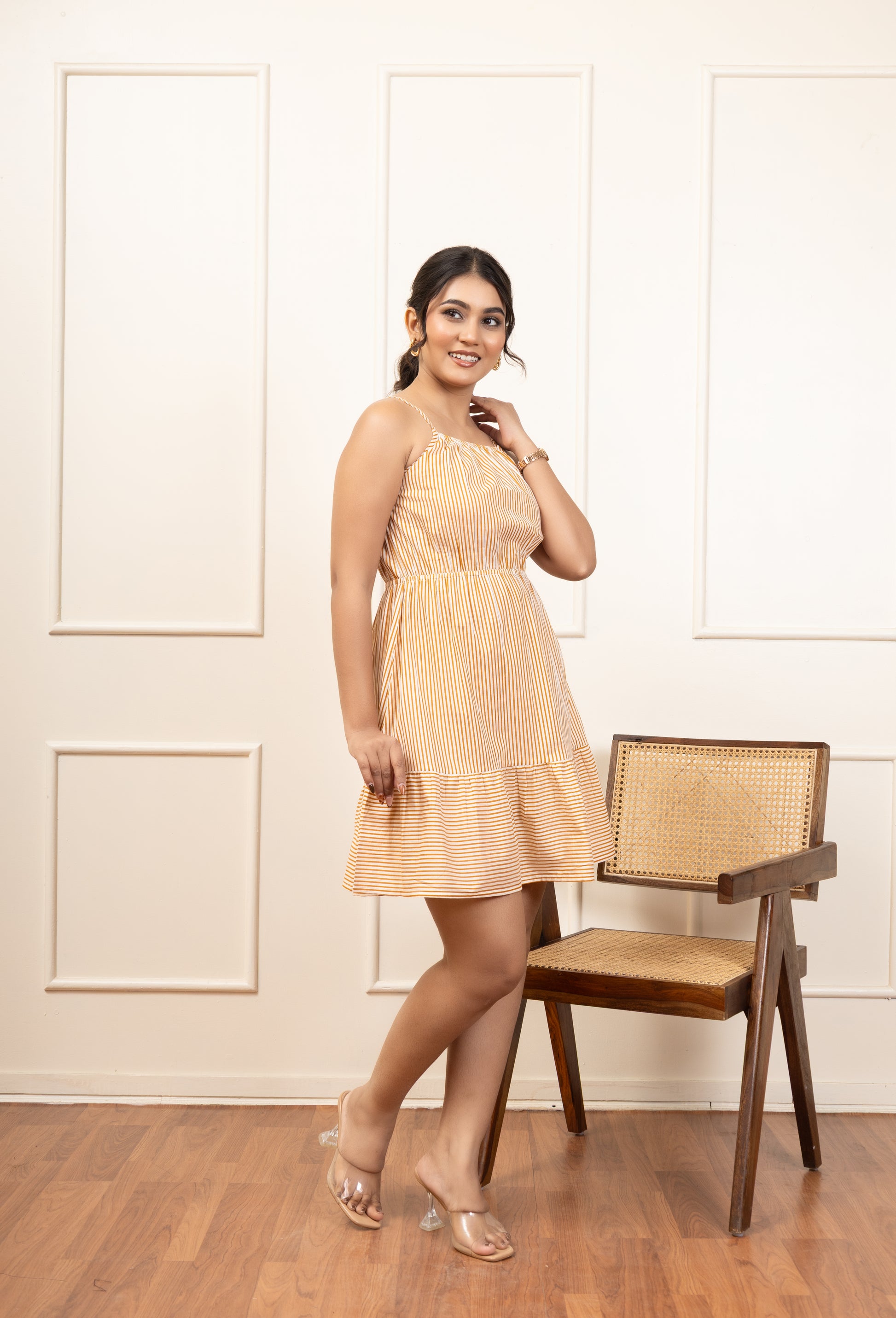 Bring sunshine to your style with this cheerful yellow striped mini dress. Designed with delicate spaghetti straps and a cinched waist, it features a flared tiered hem for a fun and flattering silhouette. Light and breezy, it’s perfect for casual days out, picnics, or summer getaways. Just pair it with sandals or clear heels for an effortlessly cute look.